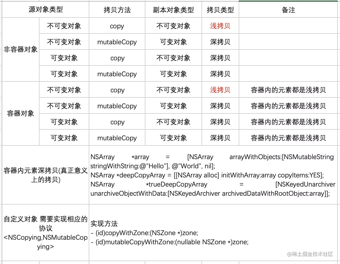 NSMutableArray *array = [NSMutableArray arrayWithObjects:[NSMutableString stringWithString:@"Hello"], @"World", nil]; // 创建了新的容器(深拷贝),容器内的元素是指针赋值 NSArray *copyArray = [array copy]; // 创建了新的容器(深拷贝),容器内的元素是指针赋值 NSMutableArray *mutableCopyArray = [array mutableCopy];