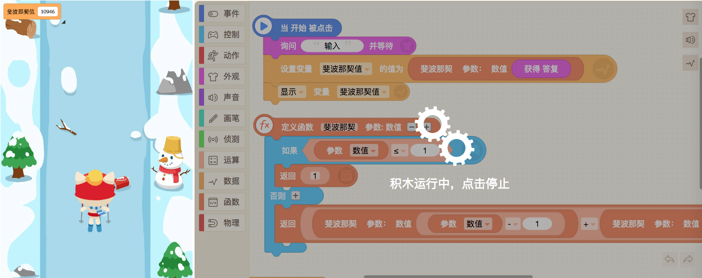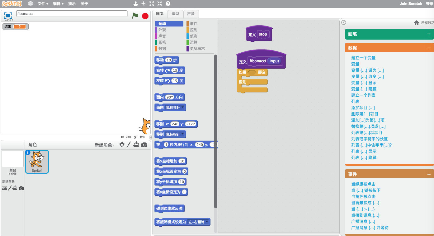 体验中最意外的是, 编程猫支持了函数返回值功能, 而即使还未发布的Scratch 3.0(Scratch 3.0 - Scratch Wiki)好像也没有这个功能. 经斐波那契测试, 感觉对于绝大多数这个环境中的用途应该足够了(函数内的局部变量没有深入测试, 不确定是否支持).