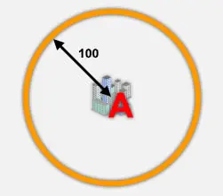 下面通过一个例子来理解2D的三边测量法,比如你的位置与A卫星的距离为100km,则你可能的位置是在以A卫星为中心的一个圆上。