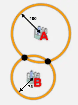 接着你又向另外一个卫星B发出无线信号,测量的距离时75km,则此时你的位置有两种可能,就是两个圆的相交点。