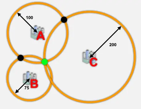 最后向卫星C发出无线信号,测量得出的距离为200km,此时三个圆的相交点就能唯一定位一个位置,这个位置即是你的位置。也就是说三个卫星就能确定一个平面上的点,只要坐标系建立起来便能得到详细的xy值。