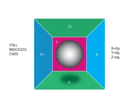 为了方便理解惯性测量装置的加速度,我们可以将加速度计想象成一个箱子里面悬浮着一个球,它们处于无重力的太空中。当我们向左边施加一个重力加速度(1g)时,球会向X-方向的壁平面产生1g的压力,然后我们就能够测量到x轴上的加速度为-1g。