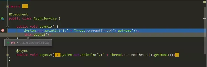 第一行第二行对应async1()方法,第三行对应async2()方法,可以看到直接使用asyncService.async2()调用时使用的线程为SimpleAsyncTaskExecutor,而在async1()方法中使用this调用,结果却是主线程,原调用线程一致。这说明@Async在this调用时没有生效。