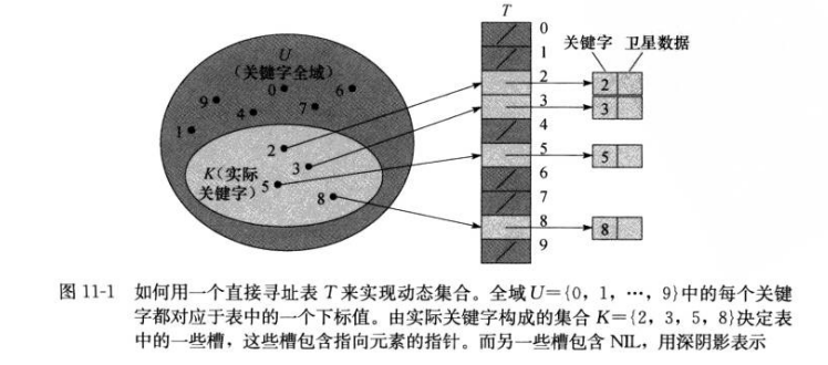 当关键字的的全域U比较小时,直接寻址是一种简单而有效的技术。举个例子:为了描述某一组数据,如果这些数据的关键字只可能是0-10之间的某个自然数,某次的得到的数据的关键字为2、3、5、8,那么这张表的结构就如下图所示: