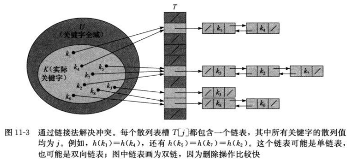 链接法就是将散列到同一个槽中的所有元素都放在一个链表中,如下图所示: