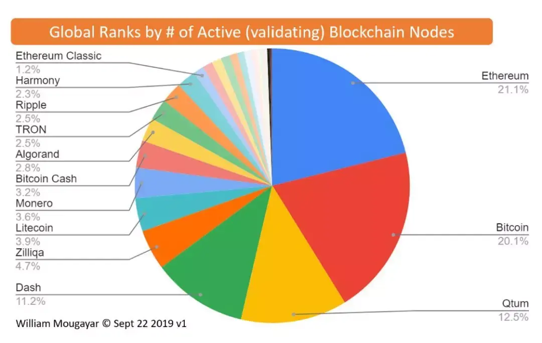 钟文斌:Qtum 量子链是一条 permissionless 的公链,项目开始于2016年,结合了当时行业中各种先进的想法和技术,成为第一个成功地在比特币的UTXO模型之上实现智能合约的项目。你完全可以认为 Qtum 是比特币的一个大升级,所有 Qtum 的创新理论都可以集成到比特币上,这在技术上是可行的,并且已经成功稳定运行了两年。Qtum在设计之初就采用了PoS共识机制,降低成为全节点的门槛。发展至今,Qtum已经是全球仅次于比特币和以太坊的第三大区去中心化网络,几乎所有的全节点都由生态中的参与者自发运行,最新节点排名可以参考下图新闻数据: