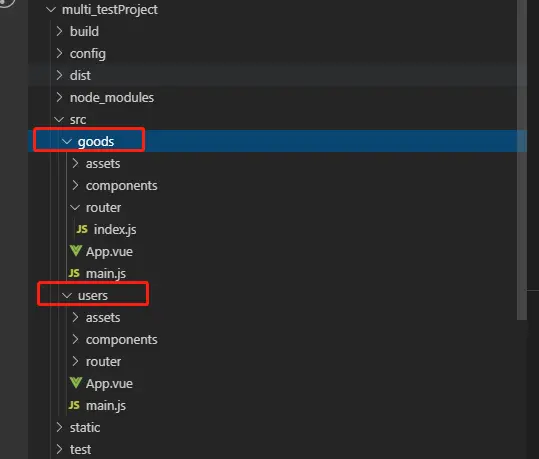 项目结构图,项目src 部分分为goods 和 users 两个部分,配置文件公共