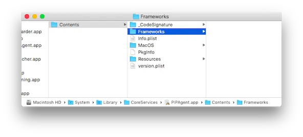 以下是 macOS 10.12.1 中的 PIPAgent.app 的 Frameworks 文件夹的内容 /System/Library/CoreServices/PIPAgent.app/Contents/Frameworks/: