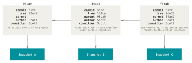 首先回顾下Git保存数据的方式:Git保存的不是文件的变化或差异,而是一系列不同时刻的文件快照。Git进行提交操作的时候,会保存一个提交对象,该对象会包含一个指向内容快照的指针,还包含了作者的姓名和邮箱、提交时输入的信息以及指向它的父对象的指针(首次提交产生的提交对象没有父对象,普通提交操作产生的提交对象有一个父对象,而由多个分支合并产生的提交对象有多个父对象),类似于链数据结构。