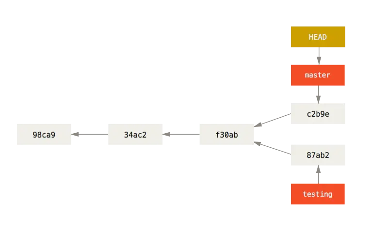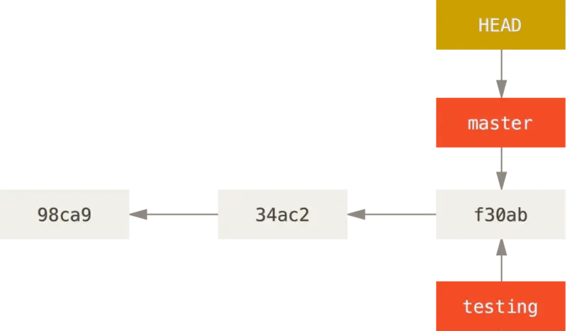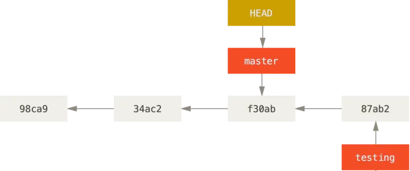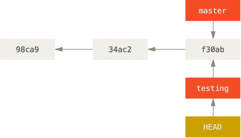 这样,就切到我们刚才新建的testing分支上,即HEAD指向了testing分支