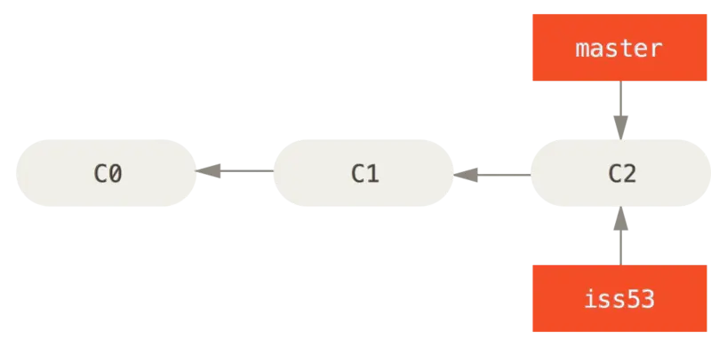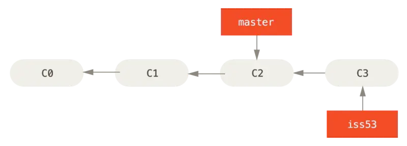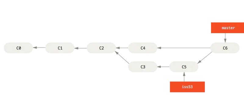 假设你已经修正了 #53 问题,并且打算将你的工作合并入 master 分支。 为此,你需要合并 iss53 分支到 master 分支,这和之前你合并 hotfix 分支所做的工作差不多。 你只需要检出到你想合并入的分支,然后运行 git merge 命令: