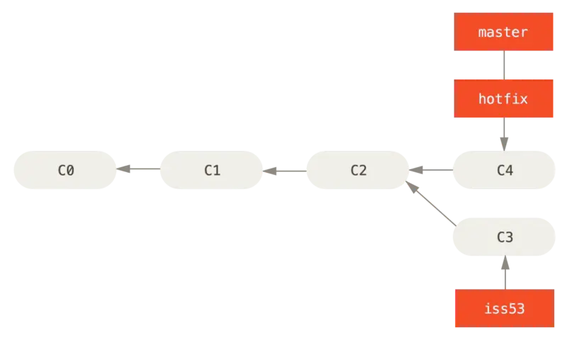 在hotfix分支上做的修复工作并没有包含到issue53分支中。如果需要拉取所做的修复,可以使用git merge master将master合并入issue53分支中(因为hotfix已删除,所以合并master分支)。 或者,可以等到issue53分支完成任务后再合并回master分支中。