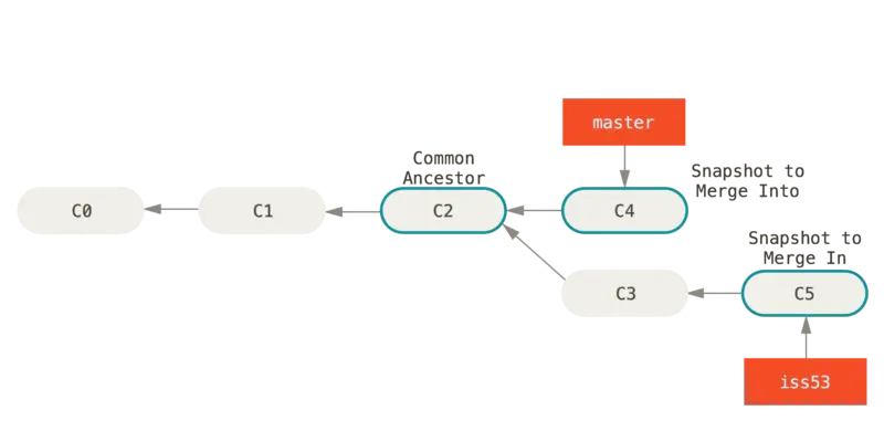 这和你之前合并 hotfix 分支的时候看起来有一点不一样。 在这种情况下,你的开发历史从一个更早的地方开始分叉开来(diverged)。 因为,master 分支所在提交并不是 iss53 分支所在提交的直接祖先,Git 不得不做一些额外的工作。 出现这种情况的时候,Git 会使用两个分支的末端所指的快照(C4 和 C5)以及这两个分支的工作祖先(C2),做一个简单的三方合并。