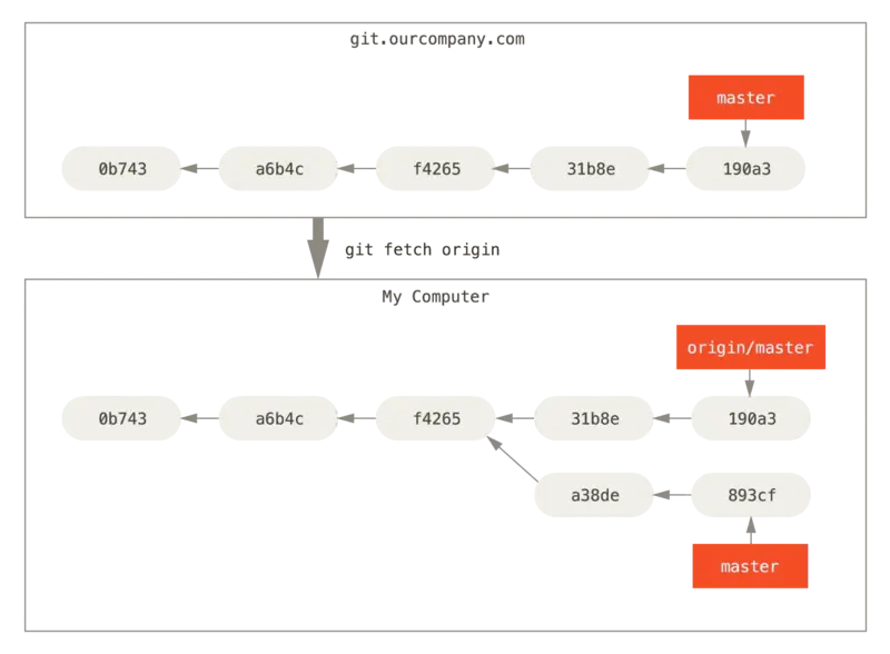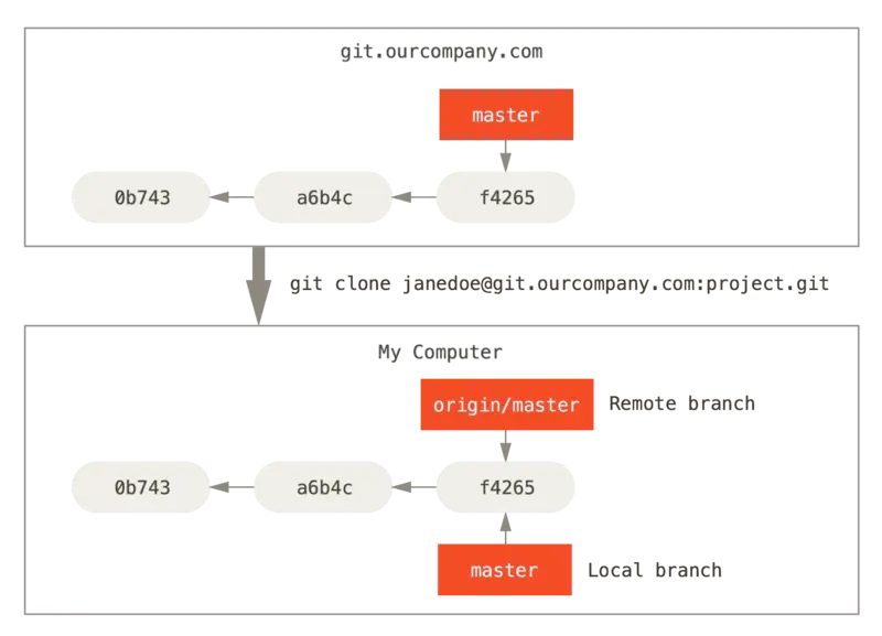 举个例子,假设你有一个git.ourcompany.com的git远程服务器,且上面已经有工作基础了的,而不是个空项目,此时你可以通过 git clone 克隆下来,拉取它的数据。此时,git为帮你将这个远程服务器命名为origin,同时拉取它的所有数据,并创建一个origin/master分支指针指向它,并且还会创建一个master本地分支,指向相同的地方,使得有工作的基础