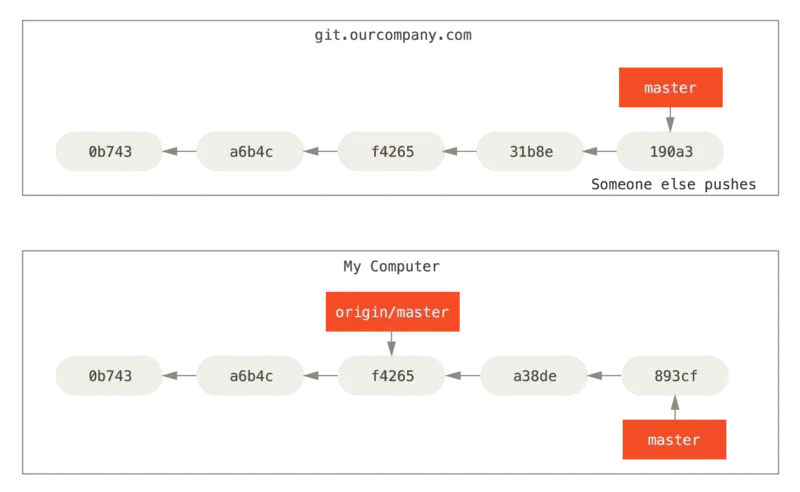 现在你在本地master分支上做了些提交,与此同时,其他人推送更新了git.ourcompany.com远程仓库。(只要你不与服务器同步,拷贝的远程分支origin/master指针就不会有移动)
