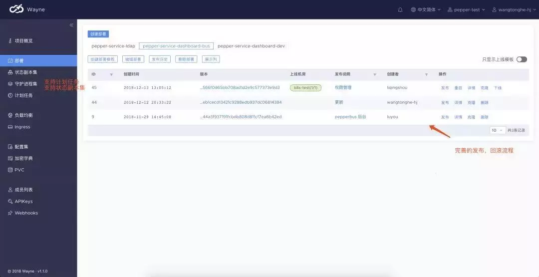 我们在使用自建集群的过程中,由于官方的dashboard操作yaml的学习成本很高,所以我们使用了wayne这个开源的k8s管理项目,其功能包含但不限于dashbaord的功能,权限管理,人员划分,部门划分等,属于是一个面向大型项目团队的k8s集群管理后台,以下是一些实例