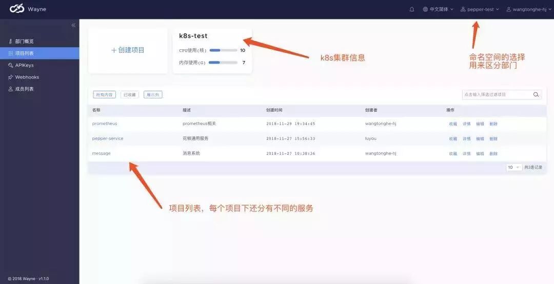 我们在使用自建集群的过程中,由于官方的dashboard操作yaml的学习成本很高,所以我们使用了wayne这个开源的k8s管理项目,其功能包含但不限于dashbaord的功能,权限管理,人员划分,部门划分等,属于是一个面向大型项目团队的k8s集群管理后台,以下是一些实例