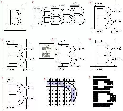 TrueType字体可能诞生于纸上,也可能从其他格式转换而来。但最终,字体文件中一定包含每个字形的描述信息。下图展示了从设计稿原件到数字化字形,再到字体文件中数字化轮廓的过程。