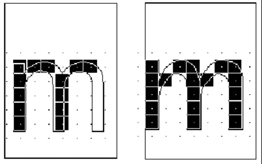 TrueType解释器怎么知道如何拉伸字形轮廓以产生可以接受的结果呢?相关信息包含在附加给字体中每个字形的指令里。指令规定了字形在被缩放时需要保留的设计。下图展示了在未运行指令的情况下渲染9点大小的Arial小写字母m时,由于主干要保持在像素中心点,结果会丢掉一条主干。而右侧的图表明,指令将主干与网格对齐,从而保持了主干的完整无缺。