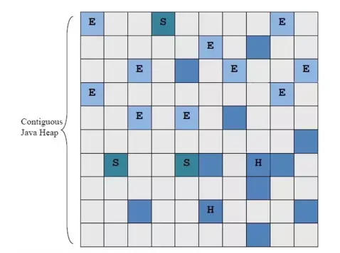 其中E代表的是Eden,S代表的是Survivor,H代表的是Humongous,剩余的深蓝色代表的是Old(或者Tenured),灰色的代表的是空闲的region。