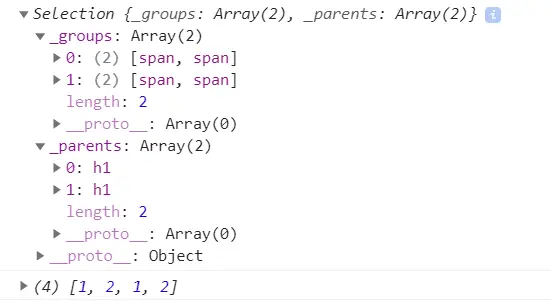 每一个旧元素(此例中为h1)会变成一个group,group中包含旧元素下匹配的元素(此例中为p);同时每一个group会有对应的