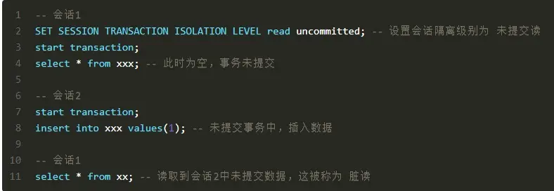事务中的修改,即使该事务未提交,对其他的事务也是可见的。可以读取到其他事务中的数据,又称为脏读,在实际数据库事务中,脏读会破坏数据的一致性,对业务产生极大影响,所以一般不推荐采用READ UNCOMMITED作为数据库事务的隔离级别。