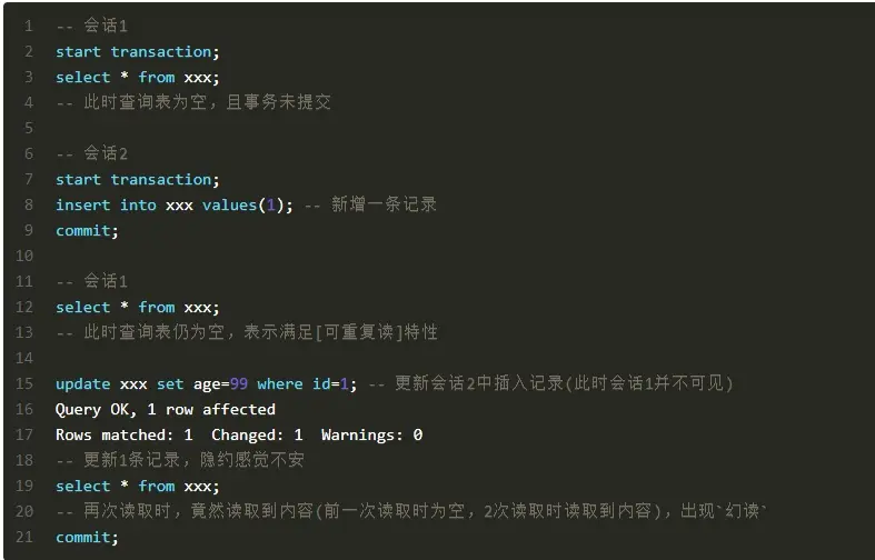 幻读则发生在事务T1读取了满足某条件的一个数据集,事务T2此时插入了一行或者多行满足T1查询条件的的数据并提交,当T1再次采用相同的条件进行读取时,得到了与第一次不同的结果集。示例如下: