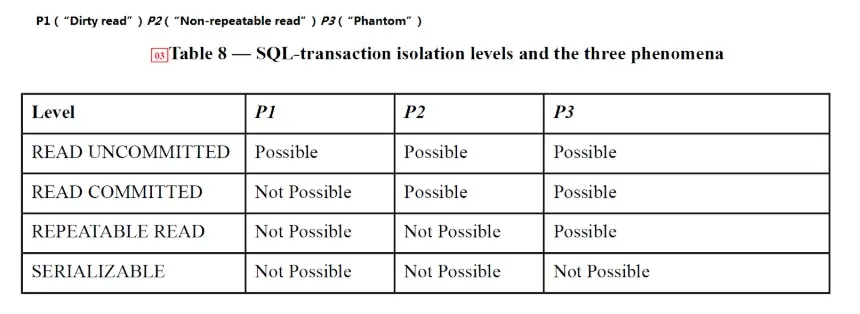 另外来看看ANSI SQL STANDARD中,对于数据库隔离级别以及相应问题的规定: