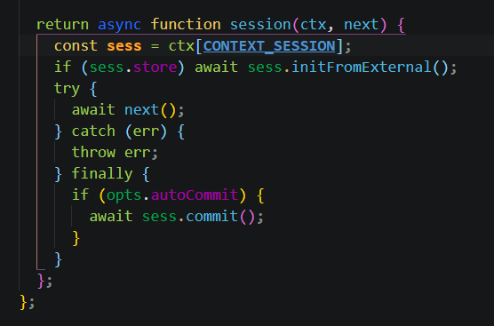 打开位于 node_modules 里的 koa-session 文件夹下的 index.js 文件 ,映入眼帘的就是这个主流程函数,接收一个 app(koa实例) 和 opt(配置文件) 作为参数