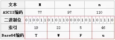 那么怎么用6个有效bit来表示传统字符的8个bit呢?8和6的最小公倍数 是24,也就是说3个传统字节可以由4个Base64字符来表示,保证有效位数是一样的,这样就多了1/3的字节数来弥补Base64只有6个有效bit 的不足。你也可以说用两个Base64字符也能表示一个传统字符,但是采用最小公倍数的方案其实是最减少浪费的。结合下边的图比较容易理解。Man是三个 字符,一共24个有效bit,只好用4个Base64字符来凑齐24个有效位。红框表示的是对应的Base64,6个有效位转化成相应的索引值再对应 Base64字符表,查出"Man"对应的Base64字符是"TWFU"。说到这里有个原则不知道你发现了没有,要转换成Base64的最小单位就是三个字节,对一个字符串来说每次都是三个字节三个字节的转换,对应的是Base64的四个字节。这个搞清楚了其实就差不多了。