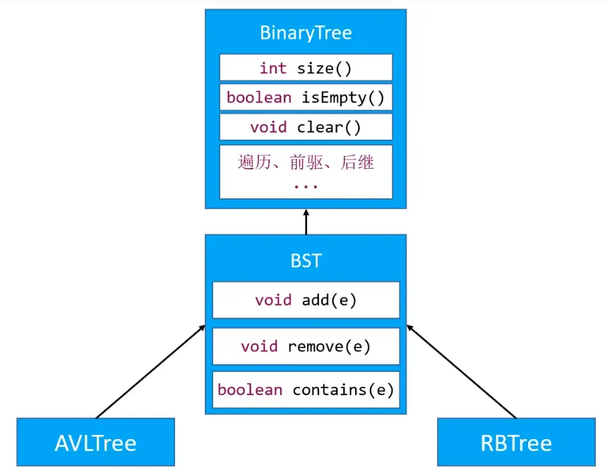 通过前面章节,我们已经了解了二叉搜索树,AVL树和红黑树是在二叉搜索树的基础上,进行了优化,因此有以下的继承结构,通过该结构,可以继续实现AVL树