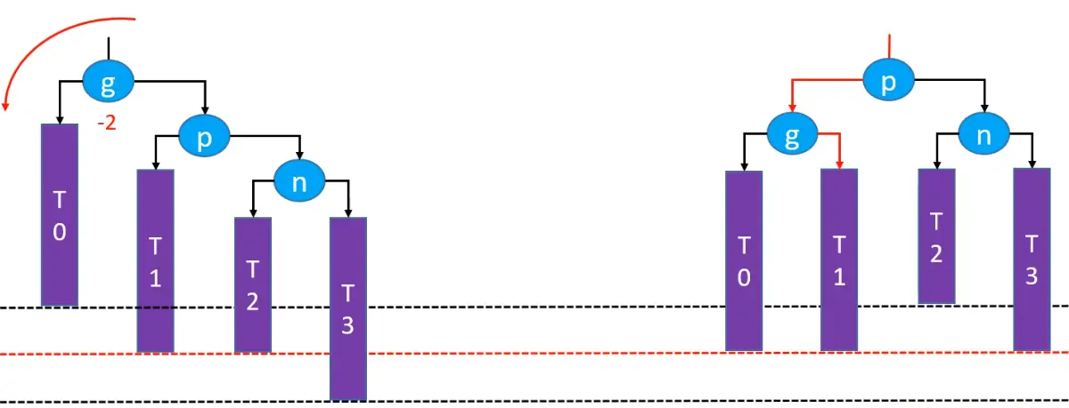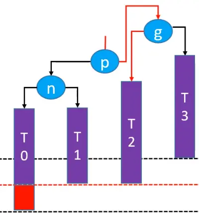 此时,该子树的高度有恢复到之前的高度,并且整棵树恢复了平衡,恢复后仍然为一个二叉搜索树,T0 < g < T1 < p < T2 < n < T3