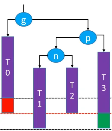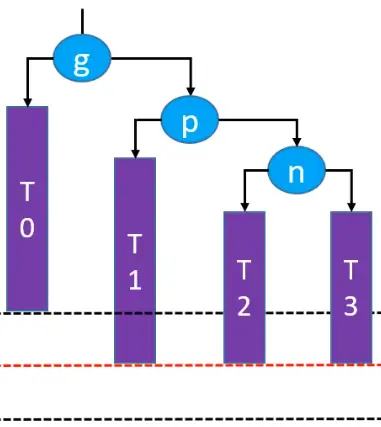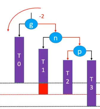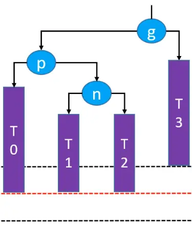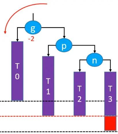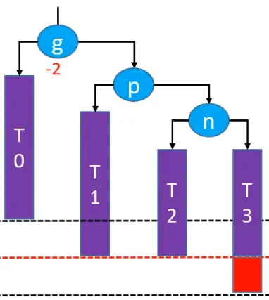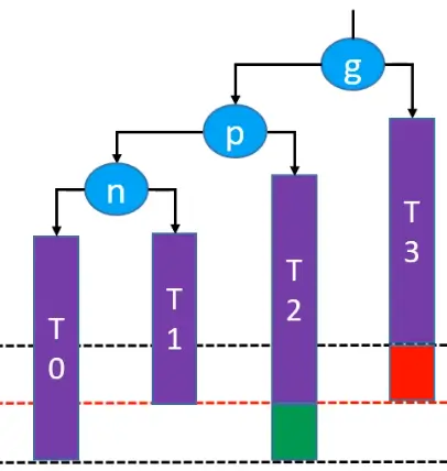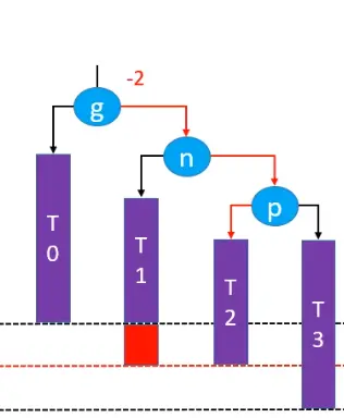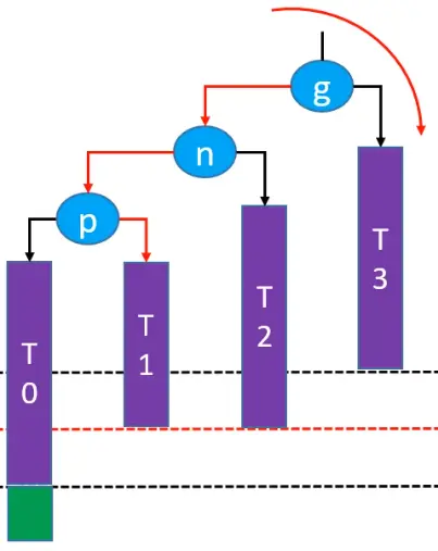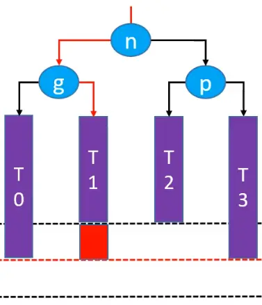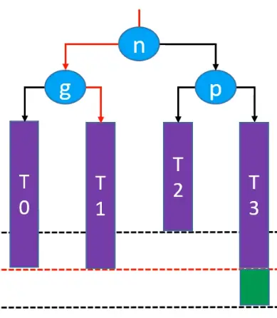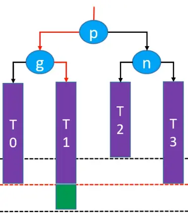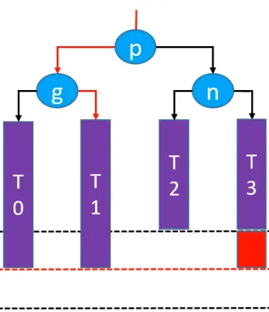 从图中可以看到,当前子树处于平衡状态,节点n的左右子树高度相等,节点p的左右子树高度相等,节点g的右子树比左子树高度低1,即当前平衡因子为1