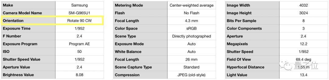 Exif中包含着照片的像素数、焦距、光圈等信息,其中还有一个方向(Orientation)的数据。