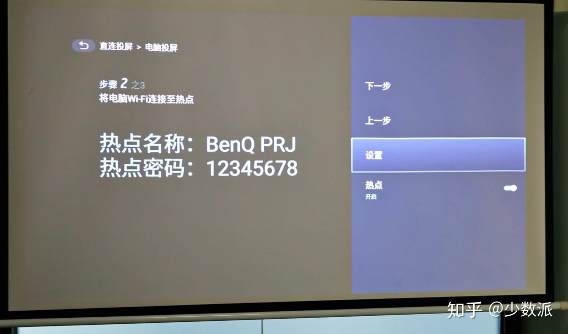 E580T 提供的无线投屏功能还不止这些,它还有一个更重要的功能——就算没有本地 WiFi,你也能照样投屏。有些大型场合 WiFi 环境比较复杂,甚至一些室外场合没有 WiFi,这种时候只要利用 E580T 的内置WiFi 功能,依然可以实现无线投屏。在系统中开启「直连投屏」功能,投影仪自己会启用无线热点,只需根据提示把设备连上投影仪的内置 WiFi,就可以实现与此前一样的投屏效果。E580T 专门在后面加了一根天线以保证 WiFi 热点的信号强度,即便在较大的场地也能确保投屏稳定。