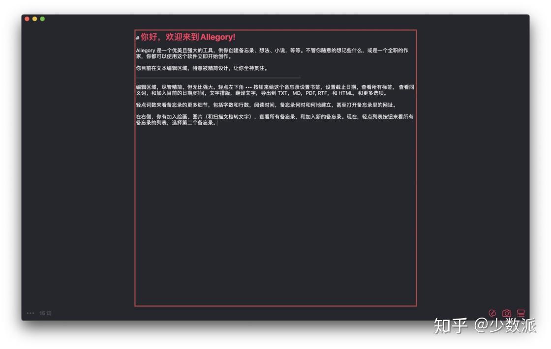 Allegory 有着与 Planny 同样的问题,笔记界面的字号显示较小,编辑区域两侧保留了大量留白区域,Allegory 目前还不支持调整笔记内容的字号、行宽度等,输入体验不是很好。