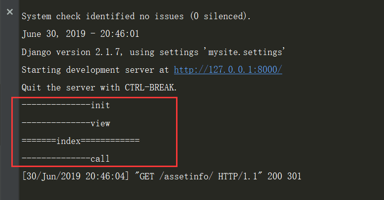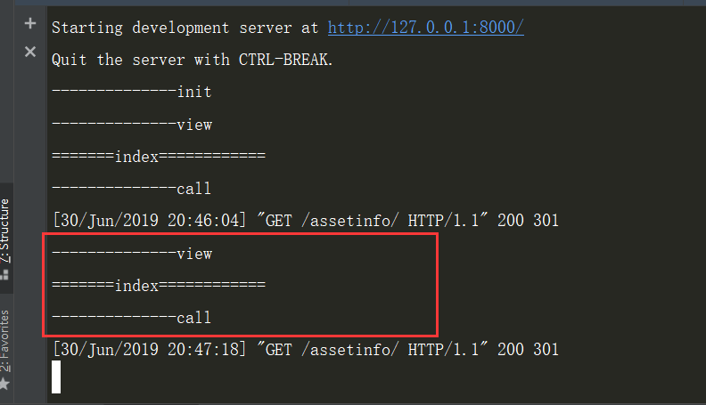 4) 访问index视图,命令行打印如下: