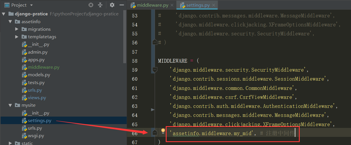 2)在mysite/settings.py文件中,向MIDDLEWARE项中注册。