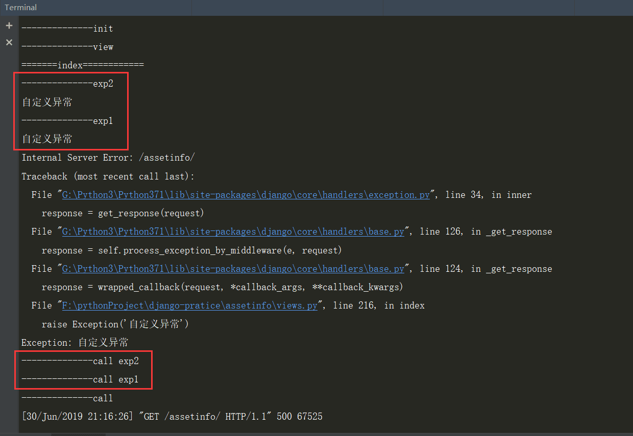 1)在assetinfo/middleware.py中定义两个异常类如下: