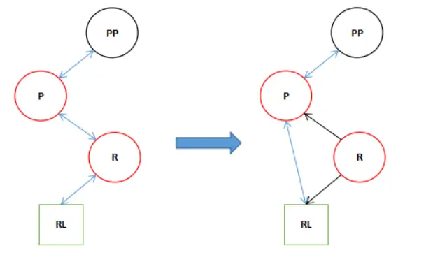 此时如果9行的条件符合的话执行10行RL指向P,如果RL为null的话,P的右节点指向null。