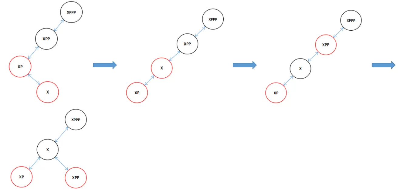 现在知道为什么XPPP可以是任意颜色的了吧,因为旋转过后X是黑色的即便XPPP是红色,此时我们又可以对两个红色的子节点进行颜色变换了,变换后X和XPPP有发生了颜色冲突,接着进行旋转直到根。