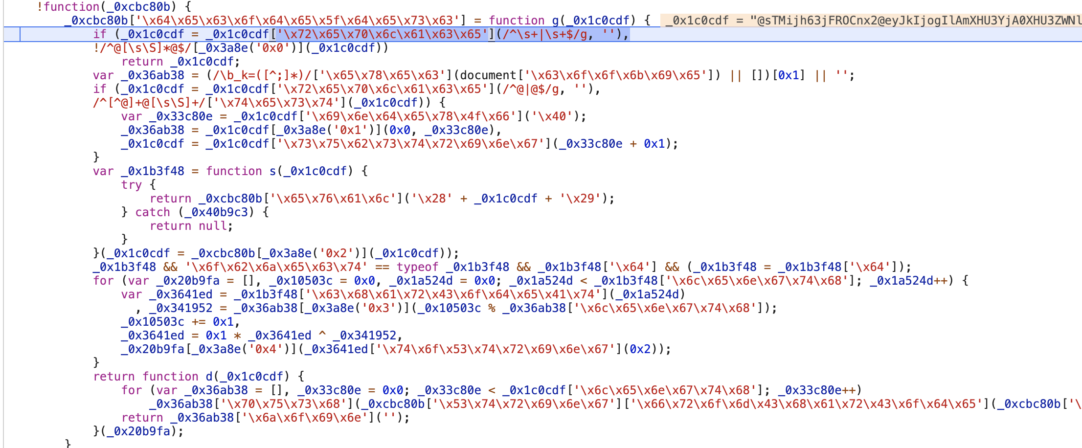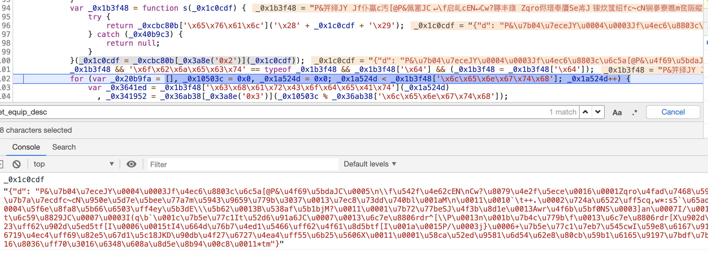 先从头逐步执行,并观察传入的值,顺带把代码复制一份并把代码里_0x1b3f48['\x63\x68\x61\x72\x43\x6f\x64\x65\x41\x74']这样的方法名翻译成正常的js代码便于理解,了解完大概解密流程,找到我们最终需要的值是这样生成的。