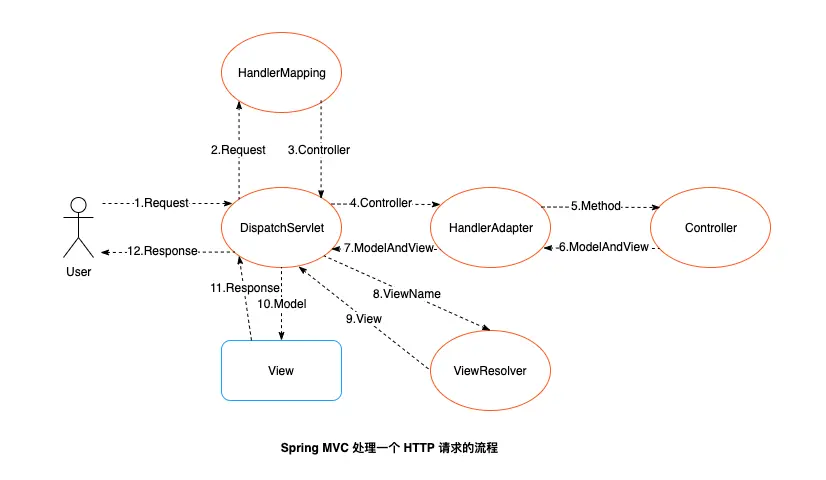 Spring MVC 处理一个 HTTP 请求的流程,如图所示: