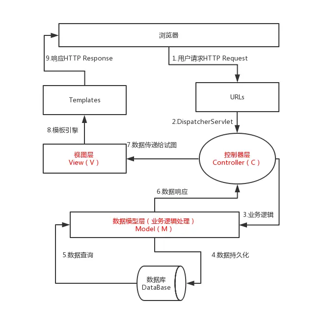 - **Model (模型层)**处理核心业务(数据)逻辑,模型对象负责在数据库中存取数据。这里的“数据”不仅限于数据本身,还包括处理数据的逻辑。