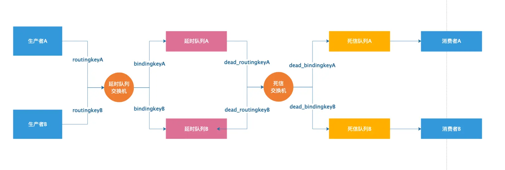 延迟任务通过消息的TTL和Dead Letter Exchange来实现。我们需要建立2个队列,一个用于发送消息,一个用于消息过期后的转发目标队列。
