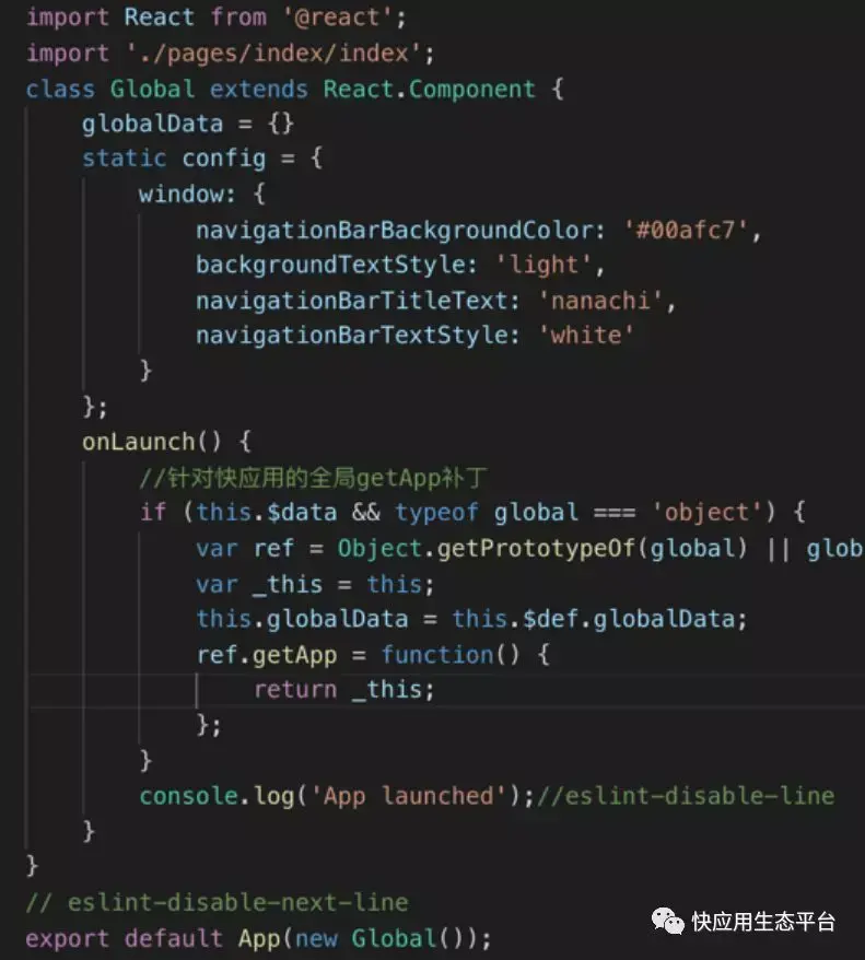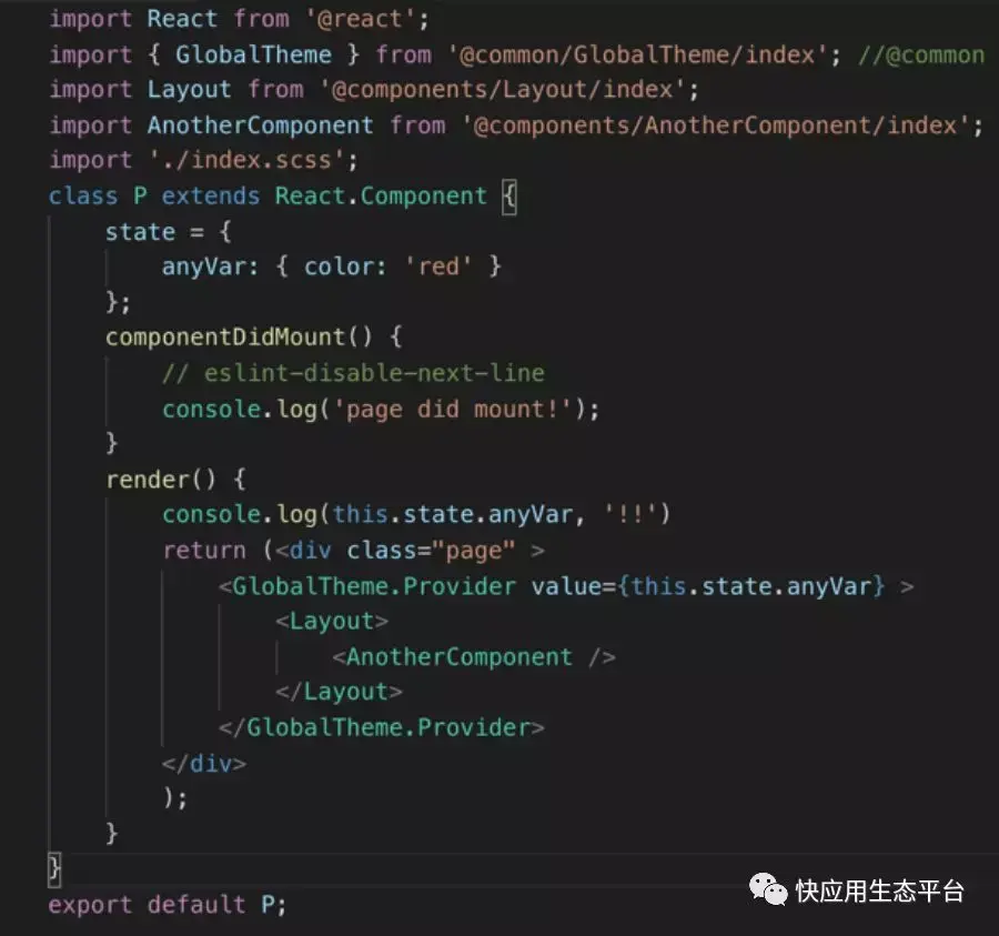 现在只有一个页面,因此只引入一个页面。页面只是用来演示React.createContext,本身没有什么可看的。但我们发现这些页面都是这样引入React——`import React from '@react'`,这是因为我们要兼容多个平台,每个平台需要React核心库也不一样,比如快应用使用ReactQuick, 百度使用ReactBu, 微信与QQ使用ReactWX。