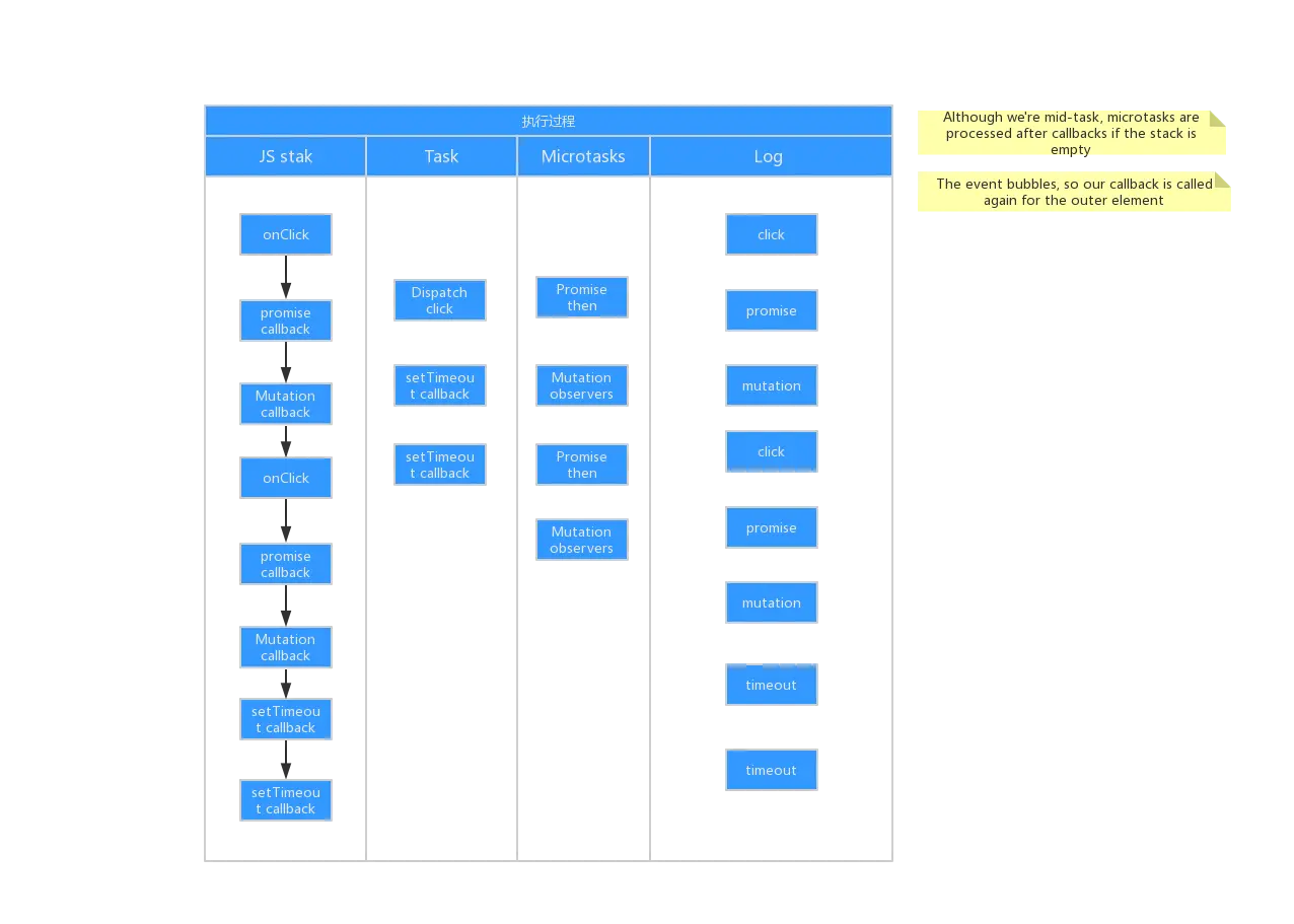 所以chrome的输出是正确的。我觉得惊讶的一点是,在当前JavaScript代码没有正在执行任务的前提下,微任务是在点击的回调函数之后执行的。我以为它会被终止。这个规则来自于调用回调函数的HTML规范:
