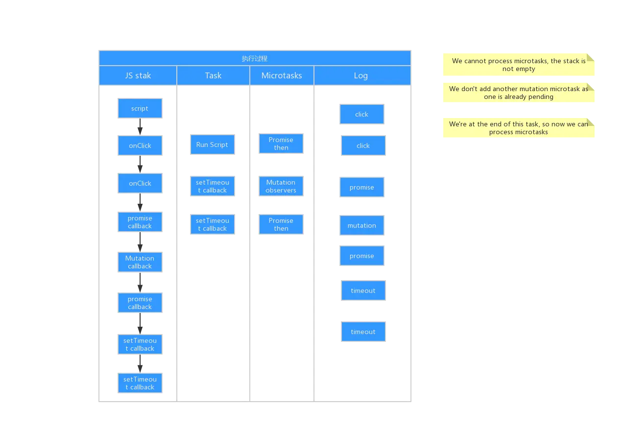 派发的点击事件是一个任务, Mutation observer 和 promise 是微任务,setTimeout 的回调函数也宏任务,所以代码的执行过程是这样的: