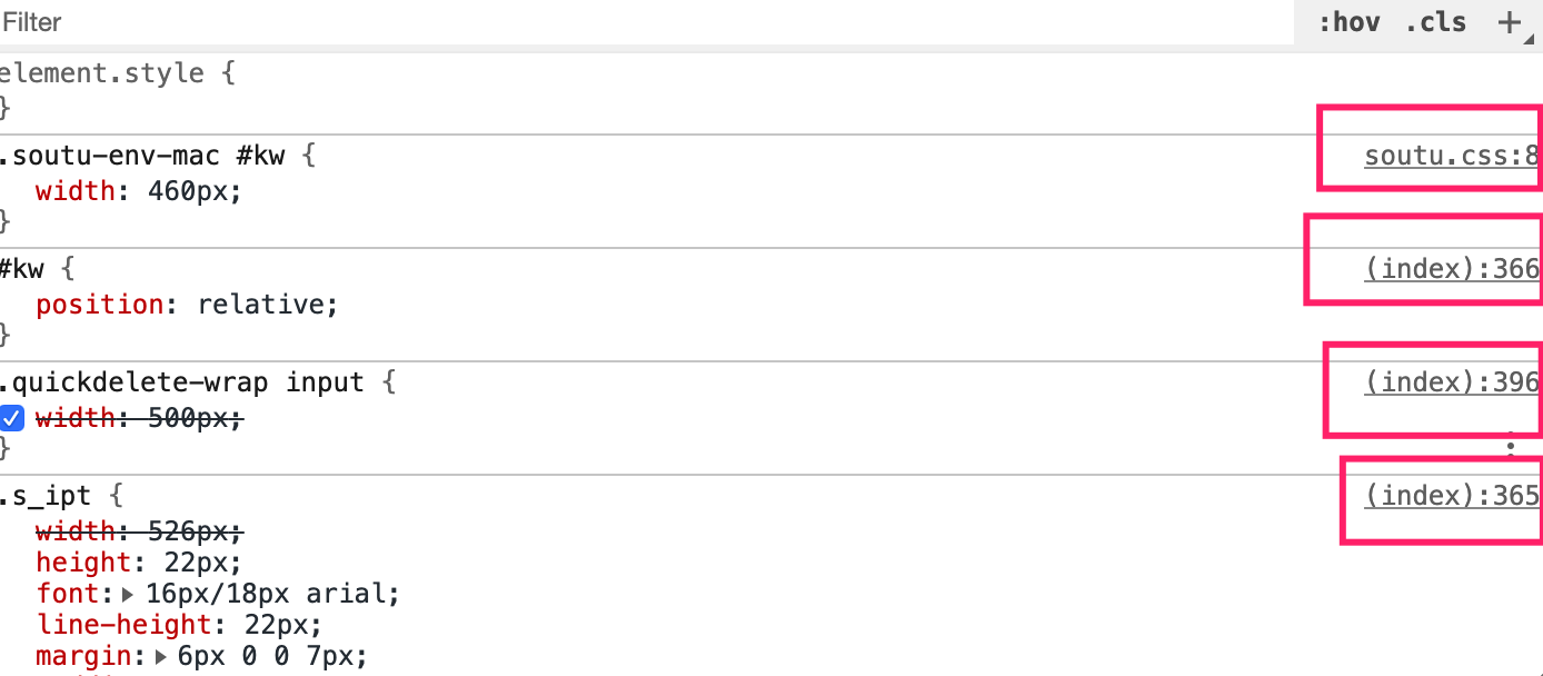 如果是正常的页面结构,CSS 是被直接放在 HTML 源码里或某个 .css 文件中的,我们只需要在 Styles 栏中点击右侧的文件名就可以直接跳转到 CSS 文档所在的位置了,如下图:
