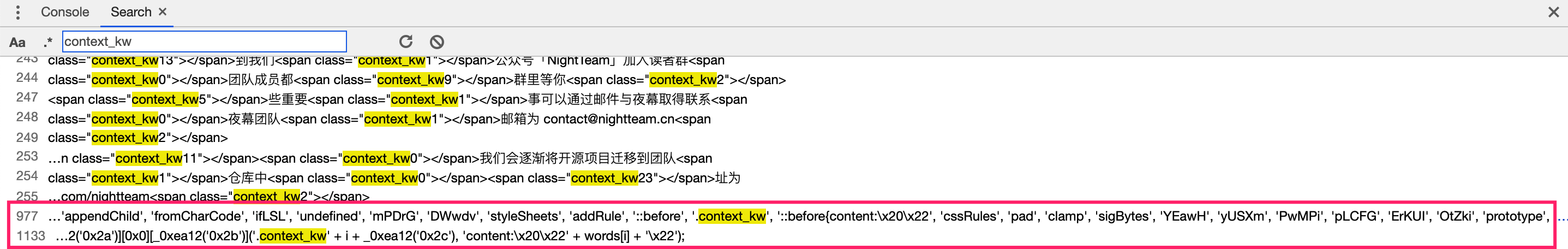 从 HTML 源码中可以看到,所有的 span 标签的类名都是 context_kw 加上一个数字拼接的,我们可以试着搜索 context_kw 看看。